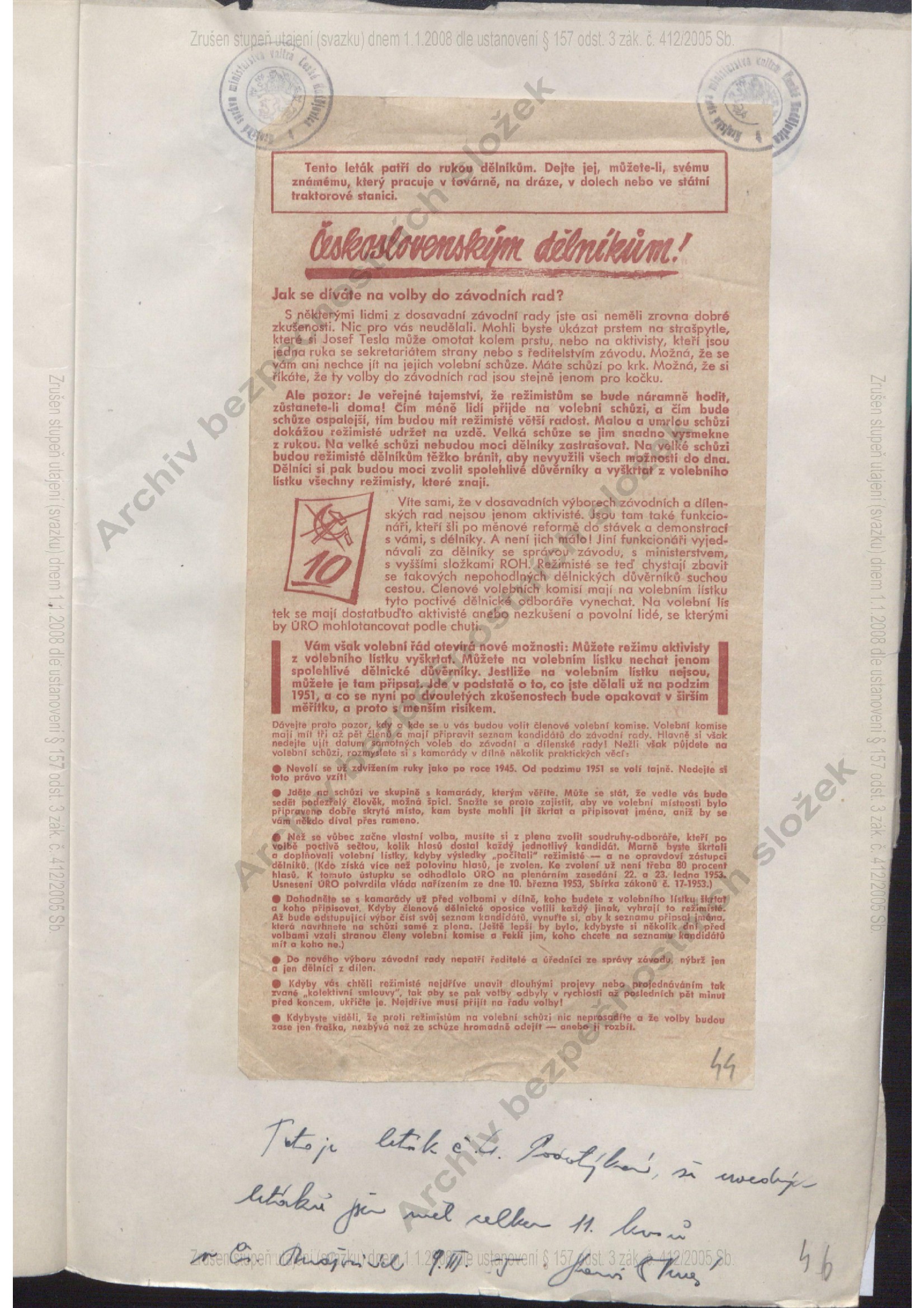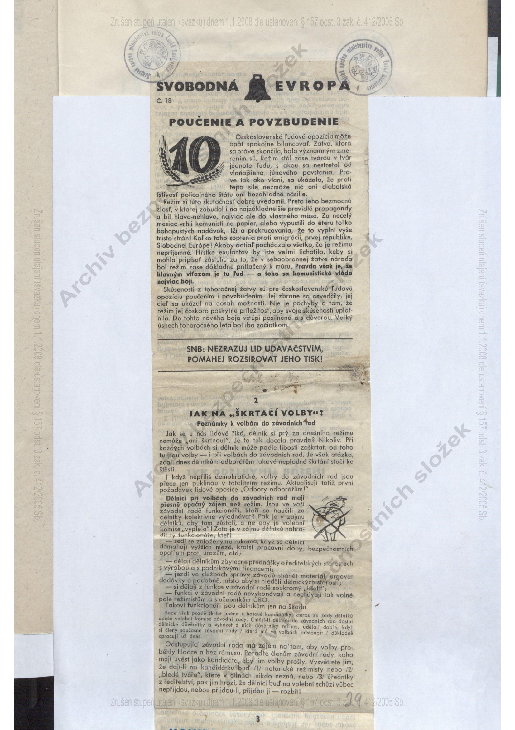 Přestože bylo na naše území dopraveno obrovské množství letáků, do dnešních dnů jich přečkal pouze malý zlomek. Několik výtisků se nachází též ve fondech a sbírkách Archivu, kde se většinou dochovaly jako předmět doličný v rámci vyšetřovacích spisů. Můžeme si tak udělat představu nejen o tom, jak letáky vypadaly a co bylo jejich obsahem, ale poodkrýt i, co se s nimi dělo po dopravení na místo určení a nahlédnout do životů lidí, kteří s nimi přišli do kontaktu.