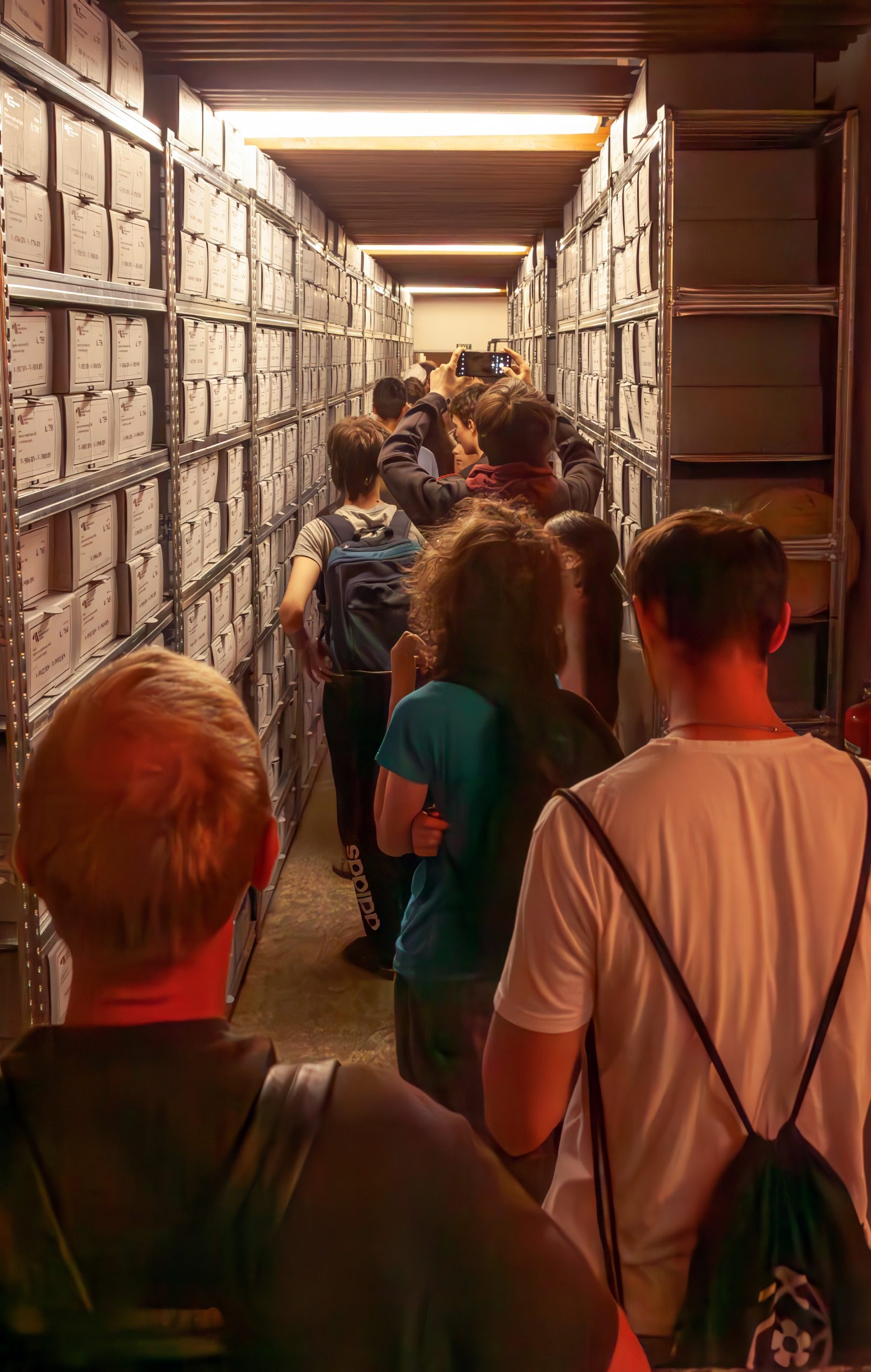 Odpoledne se prostory archivu otevřely široké veřejnosti a bylo tak možno nahlédnout do běžně nepřístupných částí budovy, navštívit restaurátorské dílny a především prohlédnout si vyšetřovací spis Státní bezpečnosti „Akce Střed“, vedený k uměle sestavené skupině Milada Horáková a spol. Tento unikátní materiál, zařazený do seznamu archivních kulturních památek, prochází od roku 2015 náročným procesem restaurování. Návštěvníci si navíc mohli sami vyzkoušet základní restaurátorské postupy – dolévání papíroviny, opravy pomocí japonského papíru nebo práci s Filmoplastem.